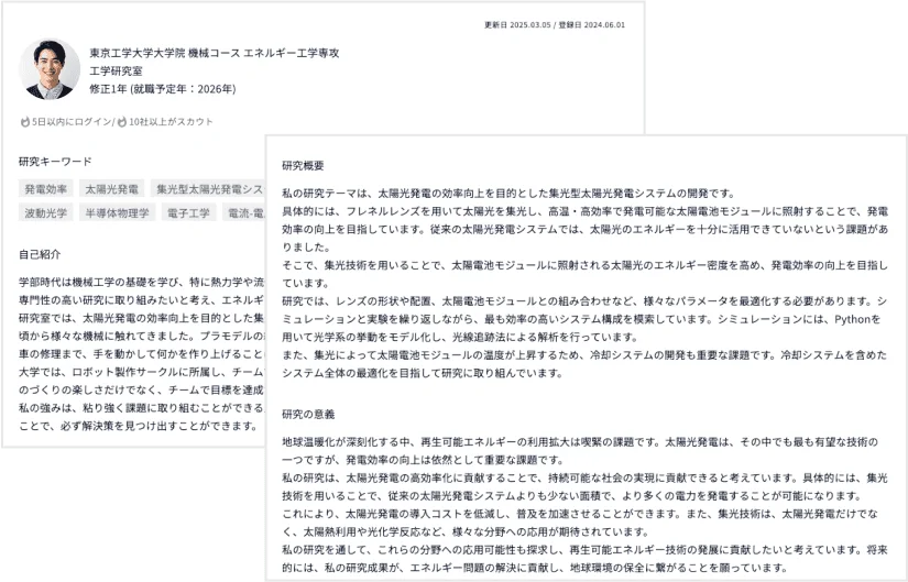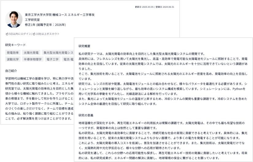 プロフィールに記載の研究概要や希望職種、就職先に求めること、活かせるスキルなど軸に検索することも可能です。