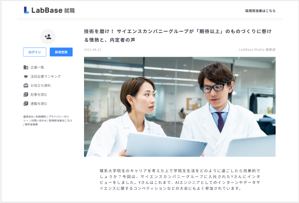 A. LabBase就職の大きな特徴は「理系学生に特化したデータベース」と「学生プロフィールの充実度」です。研究室を直接訪問しながらデータベースを作り上げてきたため、他社ダイレクトリクルーティングサービスのデータベースと被りが少なく、他の媒体では出会えないような学生にも直接スカウトを送ることができます。