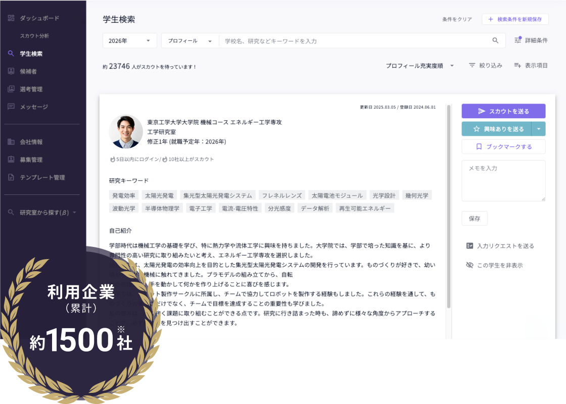 多彩な検索軸から、本当にマッチするスキル・経験を持つ学生を的確に見極められます。