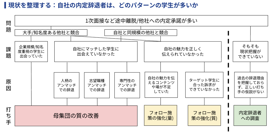 原因によっては、内定後のフォローのみでは対策しきれず、「母集団形成の質」を改善する必要があるものもあるため、それらを切り分けて整理していきます。