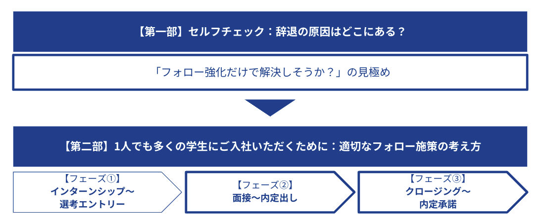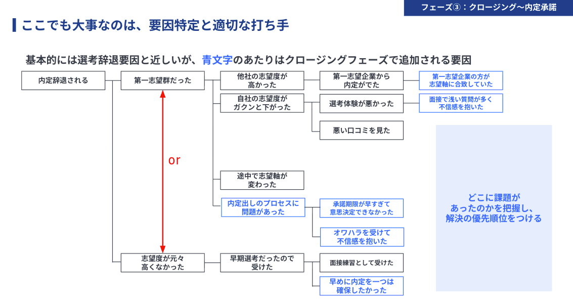 「クロージング〜内定承諾フェーズ」においても同様に、内定辞退の理由を深掘りし、対策を決めていきます。