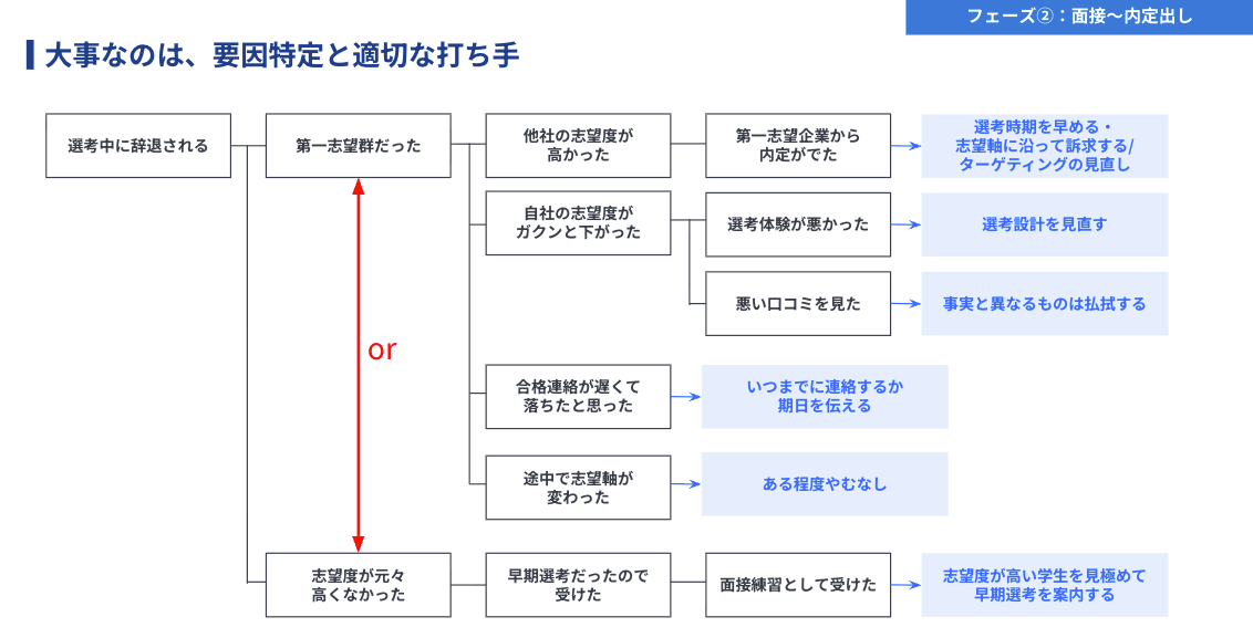 「面接〜内定出しフェーズ」においては、下記のように選考辞退の理由を深掘りし、対策を決めていきます。
