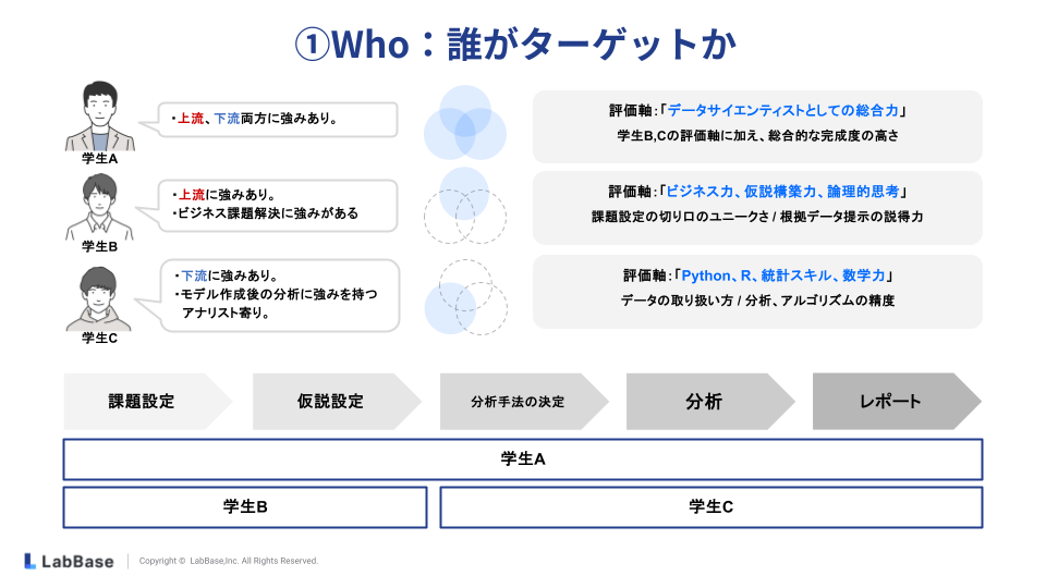 • 学生A(総合力):上流(ビジネス課題設定)と下流(分析・アルゴリズム)の両方に強みがある