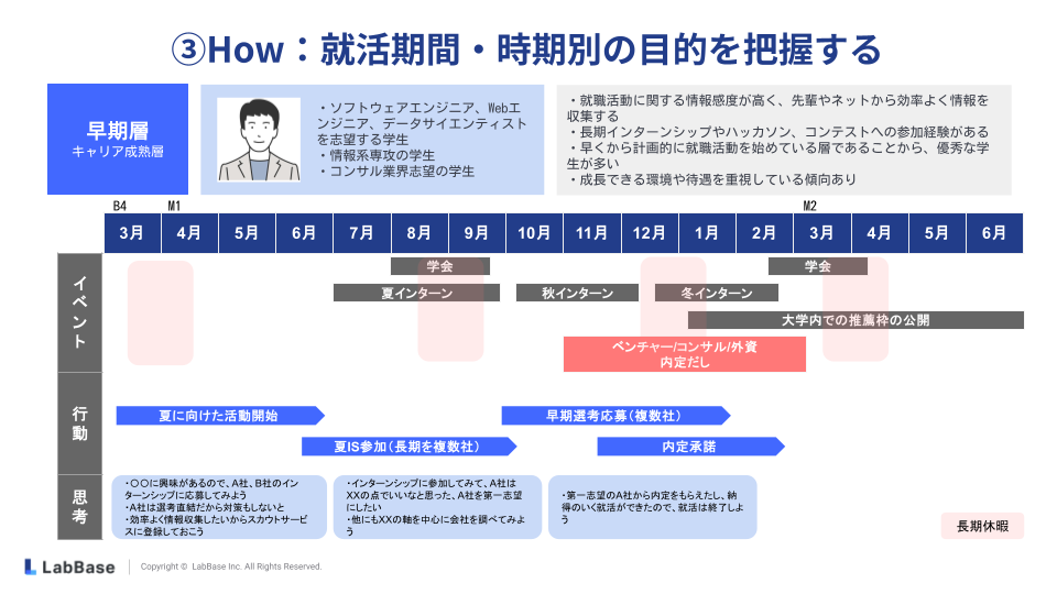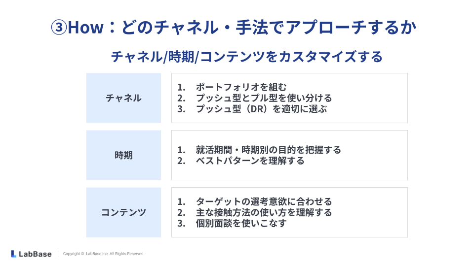 3. How(手法)として早期層の就活動向に合わせてチャネル、時期、コンテンツをカスタマイズすることが、採用成功の鍵となります。