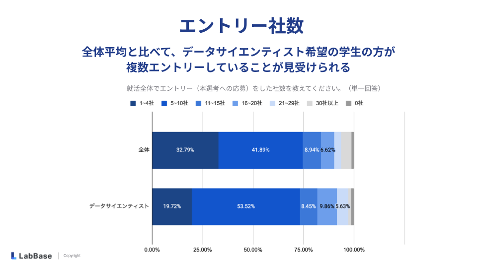 5~10社にエントリーした学生の割合を見ると、データサイエンティスト志望者は全体平均より11.63ポイント高く、積極的な就職活動を行っていることがわかります。