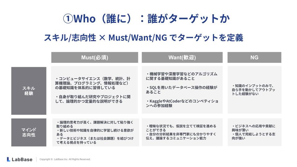 1. Who(ターゲット)をスキルと志向性で明確に定義し、