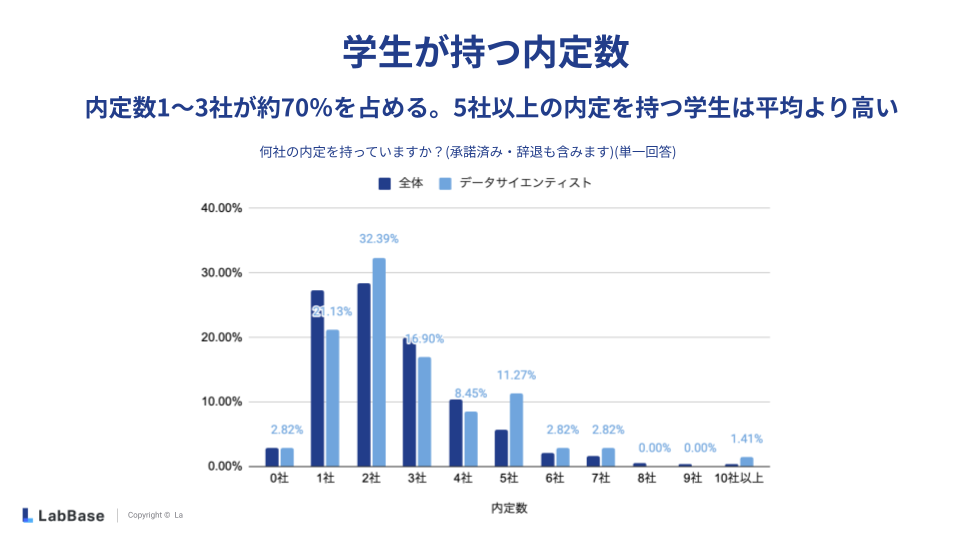 内定数については、1~3社で約70%を占めていますが 、データサイエンティスト志望の学生は5社以上の内定を持つ割合が平均より高いという特徴もあります。