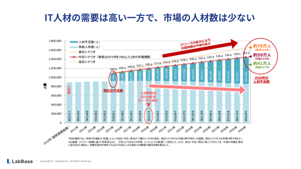 ITニーズの拡大により、IT人材の市場規模は今後も拡大し、2030年には深刻な人材不足に陥ると予測されています。特に中途採用市場では、データ分析やAIを担う技術者の絶対数が少なく、採用が困難な状況です。