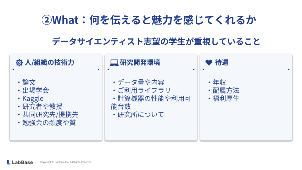 2. What(魅力)として学生が重視する「技術力」「研究開発環境」「待遇」を具体的に伝え、