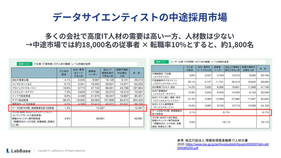 また中でもデータサイエンティストの中途市場の規模は比較的小さいと考えられます。