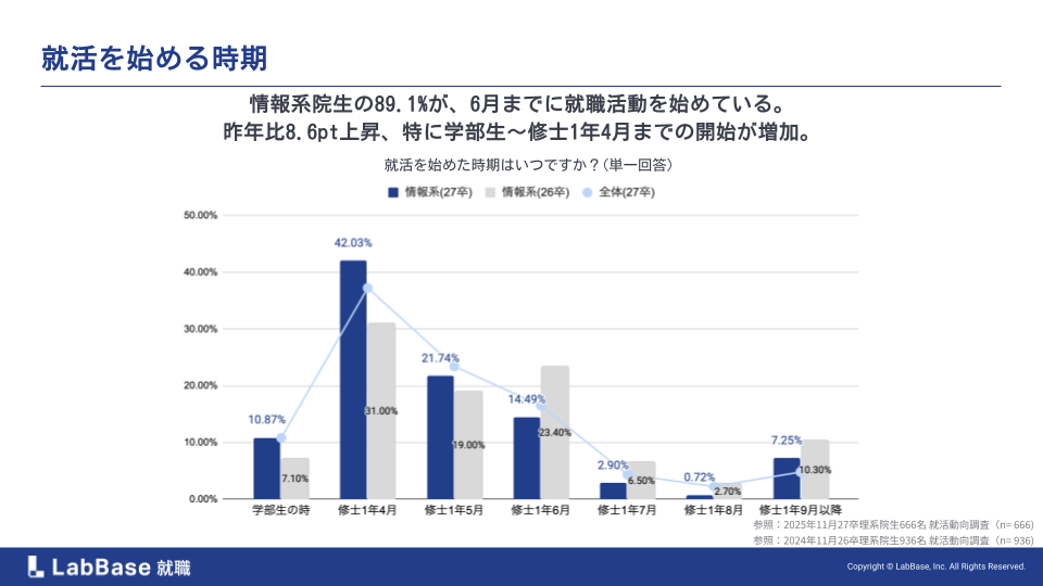- 情報系学生の約9割が修士1年の6月までに就活を開始。活動の早期化が顕著。