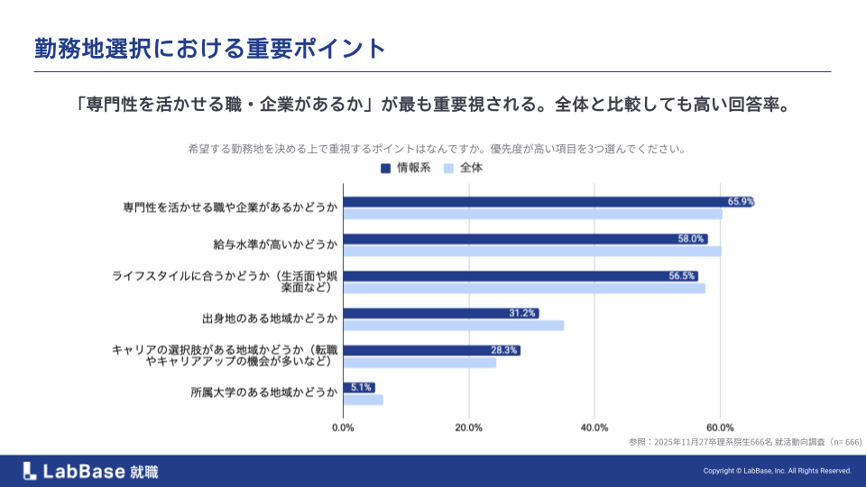 また、勤務地を選択する際においても、単に「都会が良い」「地元が良い」ということ以上に、「専門性を活かせる職・企業があるかどうか」を65.9%の学生が重視しています。