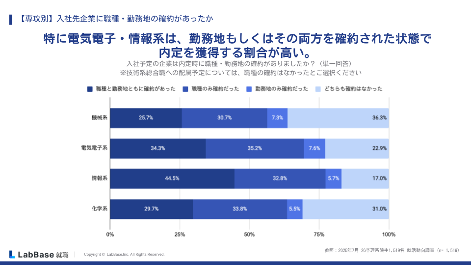 実際、情報系学生の入社予定先企業の状況を見ると、約83%の学生が「職種」または「勤務地」、あるいはその「両方」が確約された状態で内定を得ています。