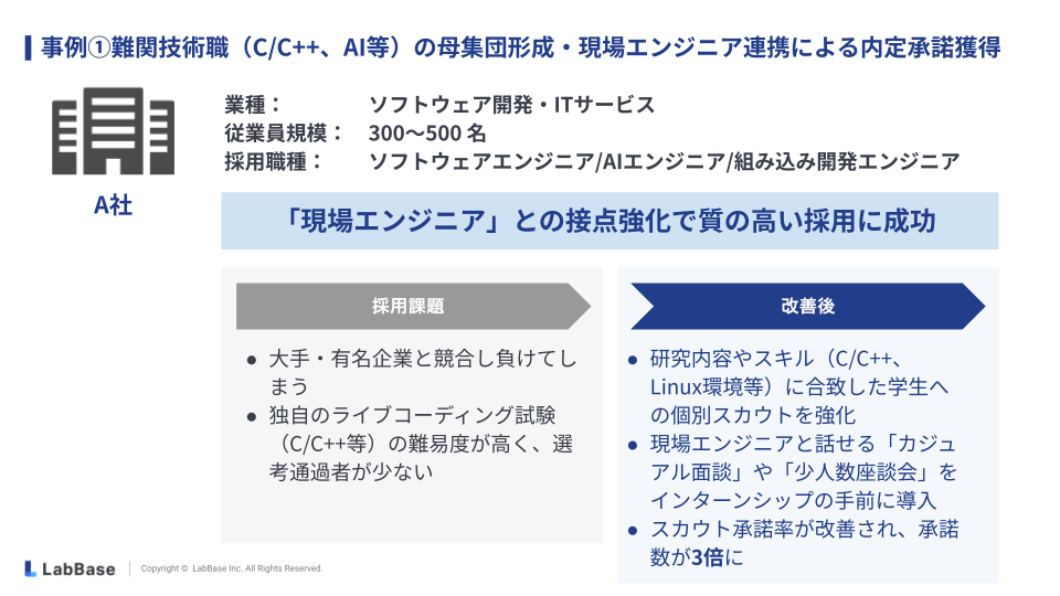 - 施策:現場エンジニアと話せる「カジュアル面談」や「少人数座談会」をインターンシップの手前に導入。研究内容やスキル(C/C++、Linux環境等)に合致した個別スカウトを強化した。