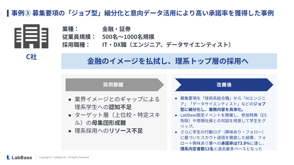 - 施策:募集要項を従来の総合職から「AIエンジニア」「データサイエンティスト」などの「ジョブ型」に細分化し、業務内容を具体化。学生の興味関心データに基づいたスカウト送信を徹底した。