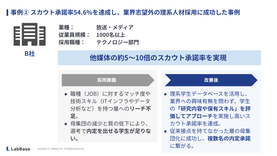 - 施策:理系学生データベースを活用し、業界への興味有無を問わず、学生の「研究内容や保有スキル」を正当に評価してアプローチ(スカウト)を実施。