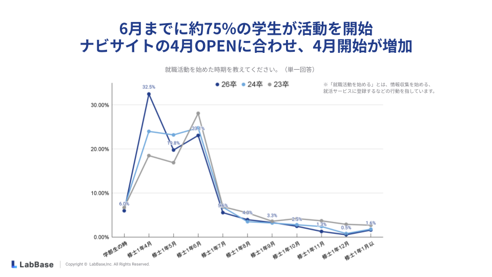 理系学生の就職活動は早期化する傾向があり、例えば弊社が行った26卒理系学生向けのアンケートの結果からは、約75%が修士1年6月までに活動を開始していることがわかります。