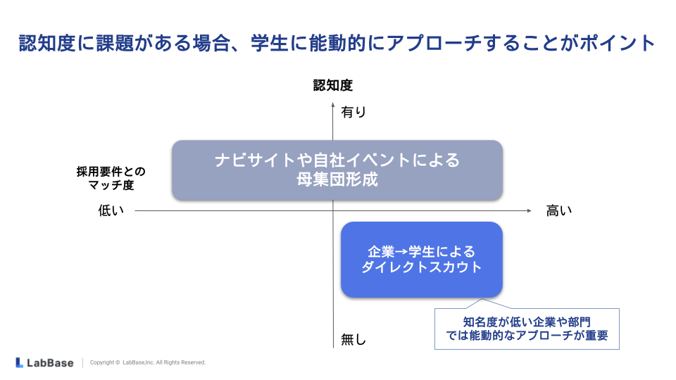 知名度が低い企業や部門は、ナビサイトなどの「待ち」の採用に頼るのではなく、企業から学生に能動的にアプローチすることが重要です。