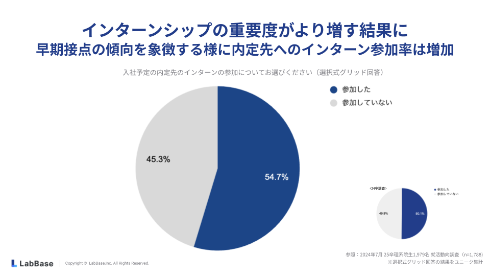 25卒理系院生の内定先企業へのインターン参加率は54.7%に上り、インターンシップの重要度がより増していることがわかります。