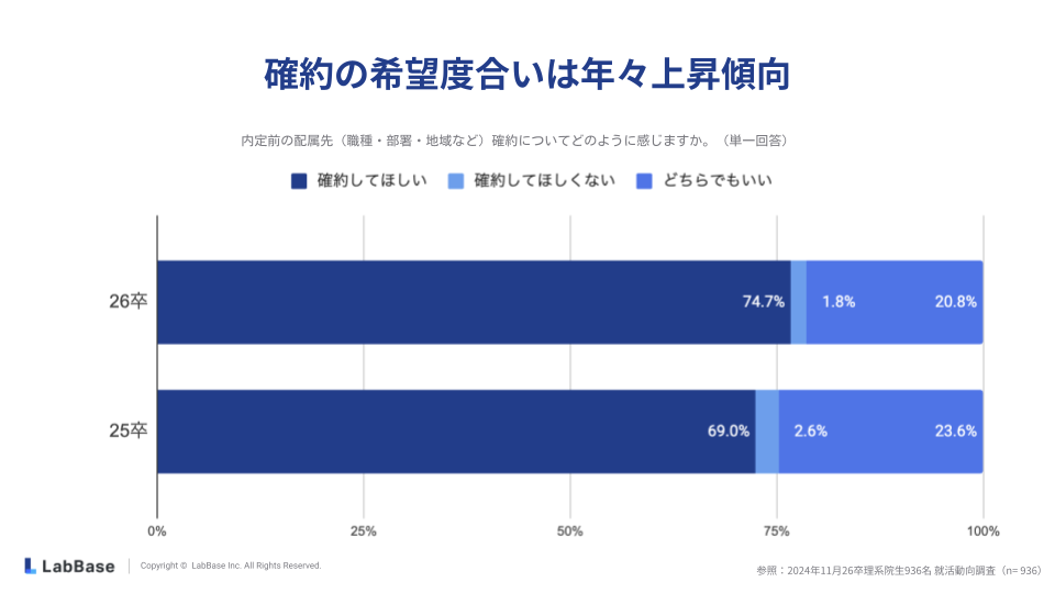 内定前の配属先確約に対する希望度合いは年々上昇傾向にあり、26卒理系学生の74.7%が「確約してほしい」と回答しています。