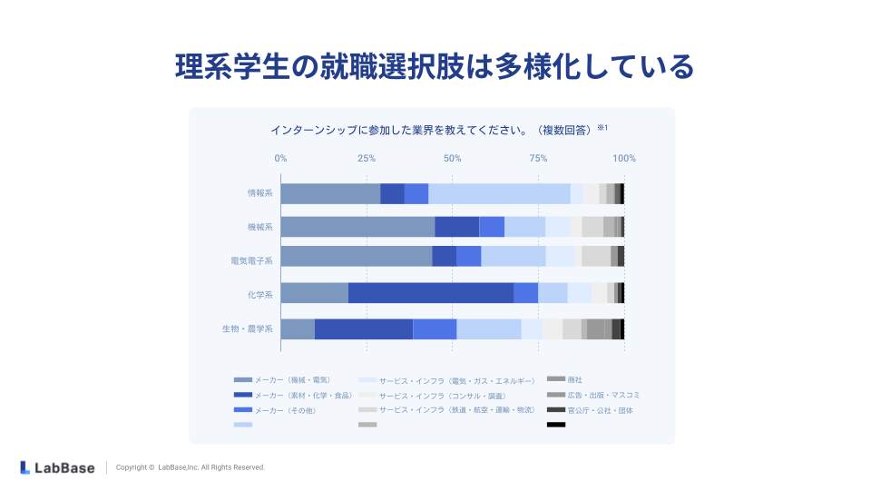 理系学生の就職選択肢は多様化しており、メーカーだけでなく、情報系、サービス・インフラ(コンサル・調査、IT・通信、エネルギー)など、幅広い業界のインターンシップに参加する傾向が見られます。