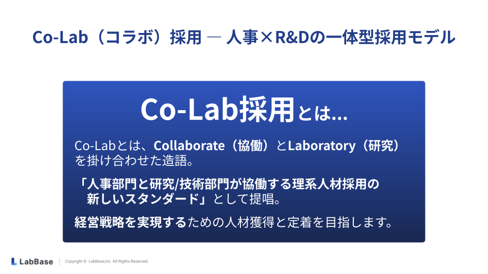 現場部門の関与の重要性の高まりを踏まえ、弊社では「人事部門と研究/技術部門が協働する理系人材採用の新しいスタンダード」として、Co-Lab(コラボ)採用を推奨しています。