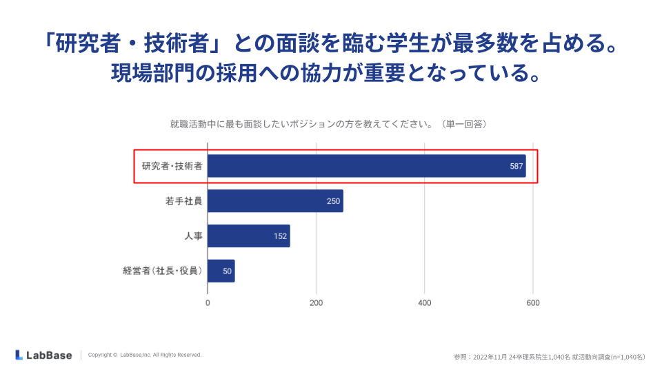 理系学生が就職活動中に最も面談したいポジションは「研究者・技術者」であり、これは他のポジション(若手社員、人事、経営者)を大きく上回る結果となっています。