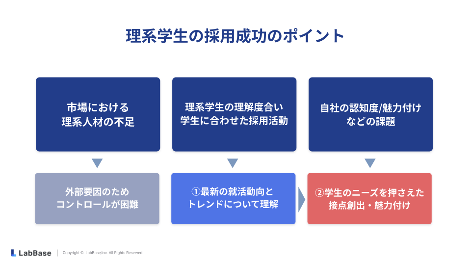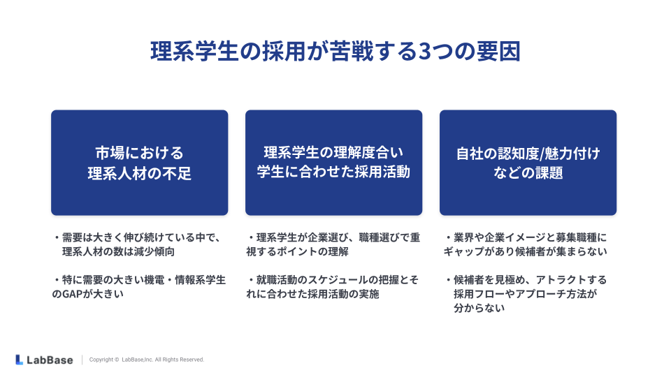 具体的には、「理系学生が企業選びや職種選びで重視するポイントの理解」や「就職活動のスケジュールの把握と、それに合わせた採用活動の実施」などが課題となります。