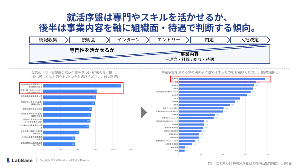 情報収集段階や、説明会・インターン参加といった就職活動序盤は「専門性やスキルを活かせるか」を重視する傾向があり、