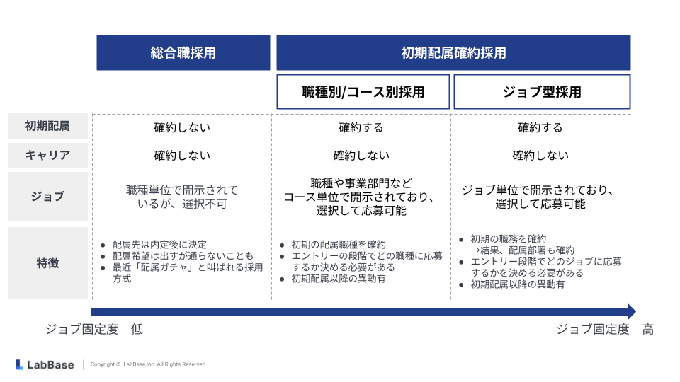 ・ジョブ型採用:初期の職務を確約し、結果として配属部署も確約する採用方式です