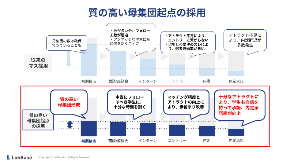 これにより、母集団形成の数を追う従来のマス採用とは異なり、「質の高い母集団形成」が可能になります。