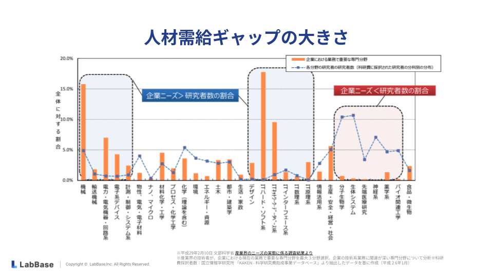 理系人材の需要は大きく伸び続けている一方で、研究・技術人材の数は減少傾向にあります。