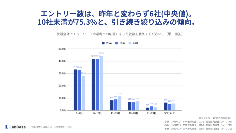 エントリー社数は中央値で6社となっており、10社未満のエントリーが75.3%を占めるなど、引き続き絞り込みの傾向が確認できます。