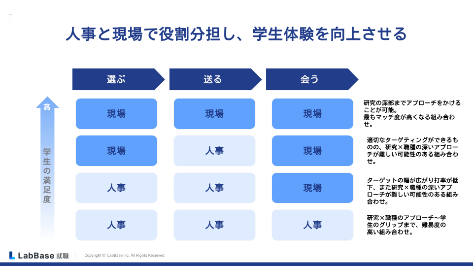 具体的には採用要件を明確にし、要件とマッチする学生に絞り込み、選定して送ることが反応率をアップさせることにつながります。