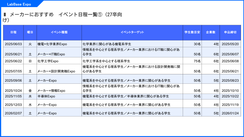 27卒メーカー系イベントテーマ一覧−127卒メーカー系イベントテーマ一覧−227卒合同説明会一覧