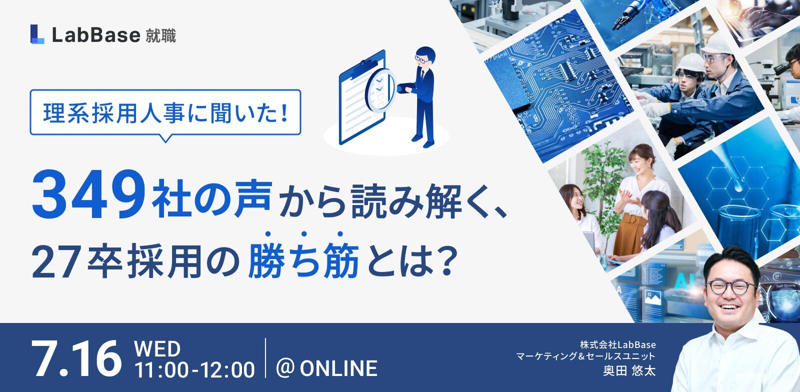 セミナーに関する個人情報の取扱いについて/株式会社LabBase(以下、当社といいます)は、当社「プライバシーポリシー( https://labbase.co.jp/about/privacy/ )」に記載の利用目的に基づき、本セミナーにお申込みいただいたお客さまの個人情報を取得させていただきます。利用させていただくにあたって、当該個人情報は「個人情報の保護に関する法律」の定めに従い、適正に取扱います。